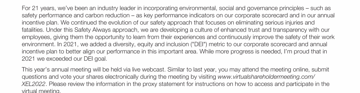 Click here to go to www.virtualshareholdermeeting.com/XEL2022 Click here to go to www.virtualshareholdermeeting.com/XEL2022 Click here to go to www.virtualshareholdermeeting.com/XEL2022 Click here to go to www.virtualshareholdermeeting.com/XEL2022 Click here to go to www.virtualshareholdermeeting.com/XEL2022 Click here to go to www.virtualshareholdermeeting.com/XEL2022 Click here to go to www.virtualshareholdermeeting.com/XEL2022 Click here to go to www.virtualshareholdermeeting.com/XEL2022 Click here to go to www.virtualshareholdermeeting.com/XEL2022 Click here to go to www.virtualshareholdermeeting.com/XEL2022