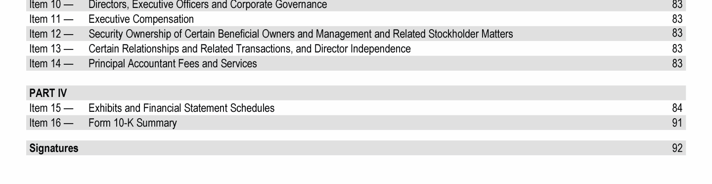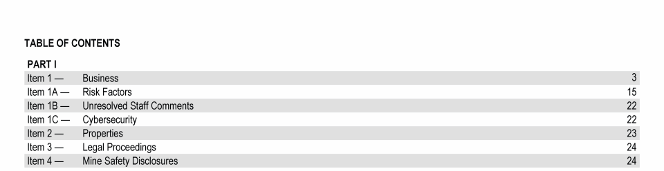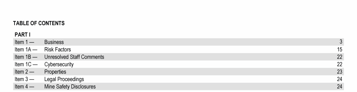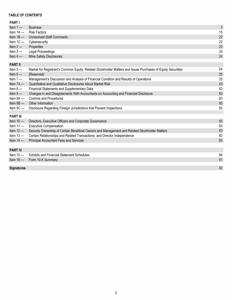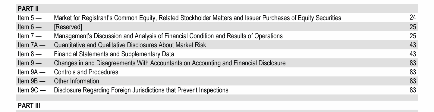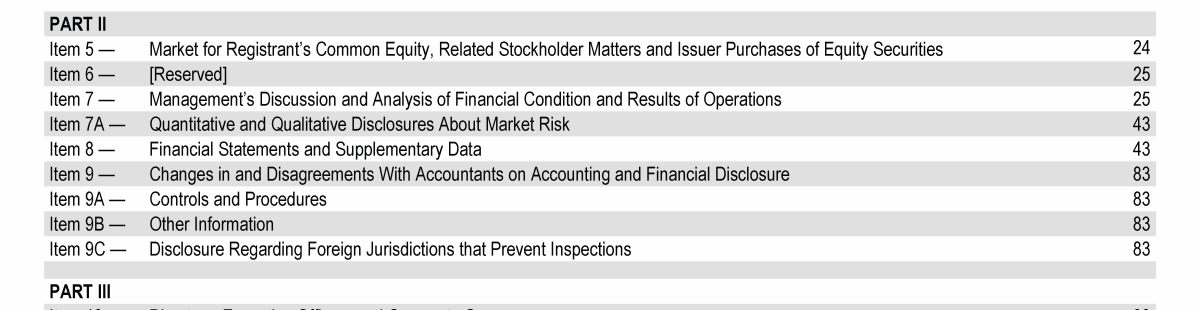 Click to view Item 1. Business Click to view Item 1A. Risk Factors Click to view Item 1B. Unresolved Staff Comments Click to view Item 1C. Cybersecurity Click to view Item 2. Properties Click to view Item 3. Legal Proceedings Click to view Item 4. Mine Safety Disclosures Click to view Item 1. Business Click to view Item 1A. Risk Factors Click to view Item 1B. Unresolved Staff Comments Click to view Item 1C. Cybersecurity Click to view Item 2. Properties Click to view Item 3. Legal Proceedings Click to view Item 4. Mine Safety Disclosures Click to view Item 1. Business Click to view Item 1A. Risk Factors Click to view Item 1B. Unresolved Staff Comments Click to view Item 1C. Cybersecurity Click to view Item 2. Properties Click to view Item 3. Legal Proceedings Click to view Item 4. Mine Safety Disclosures Click to view Item 5. Market for Registrant's Common Equity, Related Stockholder Matters and Issuer Purchases of Equity Securities Click to view Item 6. [Reserved] Click to view Item 7. Management's Discussion and Analysis of Financial Condition and Results of Operations Click to view Item 7A. Quantitative and Qualitative Disclosures About Market Risk Click to view Item 8. Financial Statements and Supplementary Data Click to view Item 9. Changes in and Disagreements With Accountants on Accounting and Financial Disclosure Click to view Item 9A. Controls and Procedures Click to view Item 9B. Other Information Click to view Item 9C. Disclosure Regarding Foreign Jurisdictions that Prevent Inspections Click to view Item 10. Directors, Executive Officers and Corporate Governance Click to view Item 5. Market for Registrant's Common Equity, Related Stockholder Matters and Issuer Purchases of Equity Securities Click to view Item 6. [Reserved] Click to view Item 7. Management's Discussion and Analysis of Financial Condition and Results of Operations Click to view Item 7A. Quantitative and Qualitative Disclosures About Market Risk Click to view Item 8. Financial Statements and Supplementary Data Click to view Item 9. Changes in and Disagreements With Accountants on Accounting and Financial Disclosure Click to view Item 9A. Controls and Procedures Click to view Item 9B. Other Information Click to view Item 9C. Disclosure Regarding Foreign Jurisdictions that Prevent Inspections Click to view Item 10. Directors, Executive Officers and Corporate Governance Click to view Item 5. Market for Registrant's Common Equity, Related Stockholder Matters and Issuer Purchases of Equity Securities Click to view Item 6. [Reserved] Click to view Item 7. Management's Discussion and Analysis of Financial Condition and Results of Operations Click to view Item 7A. Quantitative and Qualitative Disclosures About Market Risk Click to view Item 8. Financial Statements and Supplementary Data Click to view Item 9. Changes in and Disagreements With Accountants on Accounting and Financial Disclosure Click to view Item 9A. Controls and Procedures Click to view Item 9B. Other Information Click to view Item 9C. Disclosure Regarding Foreign Jurisdictions that Prevent Inspections Click to view Item 10. Directors, Executive Officers and Corporate Governance Click to view Item 10. Directors, Executive Officers and Corporate Governance Click to view Item 11. Executive Compensation Click to view Item 12. Security Ownership of Certain Beneficial Owners and Management and Related Stockholder Matters Click to view Item 13. Certain Relationships and Related Transactions, and Director Independence Click to view Item 14. Principal Accountant Fees and Services Click to view Item 15. Exhibits and Financial Statement Schedules Click to view Item 16. Form 10-K Summary Click to view Signatures Click to view Item 10. Directors, Executive Officers and Corporate Governance Click to view Item 11. Executive Compensation Click to view Item 12. Security Ownership of Certain Beneficial Owners and Management and Related Stockholder Matters Click to view Item 13. Certain Relationships and Related Transactions, and Director Independence Click to view Item 14. Principal Accountant Fees and Services Click to view Item 15. Exhibits and Financial Statement Schedules Click to view Item 16. Form 10-K Summary Click to view Signatures Click to view Item 10. Directors, Executive Officers and Corporate Governance Click to view Item 11. Executive Compensation Click to view Item 12. Security Ownership of Certain Beneficial Owners and Management and Related Stockholder Matters Click to view Item 13. Certain Relationships and Related Transactions, and Director Independence Click to view Item 14. Principal Accountant Fees and Services Click to view Item 15. Exhibits and Financial Statement Schedules Click to view Item 16. Form 10-K Summary Click to view Signatures Click to view Item 1. Business Click to view Item 1A. Risk Factors Click to view Item 1B. Unresolved Staff Comments Click to view Item 1C. Cybersecurity Click to view Item 2. Properties Click to view Item 3. Legal Proceedings Click to view Item 4. Mine Safety Disclosures Click to view Item 10. Directors, Executive Officers and Corporate Governance Click to view Item 11. Executive Compensation Click to view Item 12. Security Ownership of Certain Beneficial Owners and Management and Related Stockholder Matters Click to view Item 13. Certain Relationships and Related Transactions, and Director Independence Click to view Item 14. Principal Accountant Fees and Services Click to view Item 15. Exhibits and Financial Statement Schedules Click to view Item 16. Form 10-K Summary Click to view Signatures Click to view Item 5. Market for Registrant's Common Equity, Related Stockholder Matters and Issuer Purchases of Equity Securities Click to view Item 6. [Reserved] Click to view Item 7. Management's Discussion and Analysis of Financial Condition and Results of Operations Click to view Item 7A. Quantitative and Qualitative Disclosures About Market Risk Click to view Item 8. Financial Statements and Supplementary Data Click to